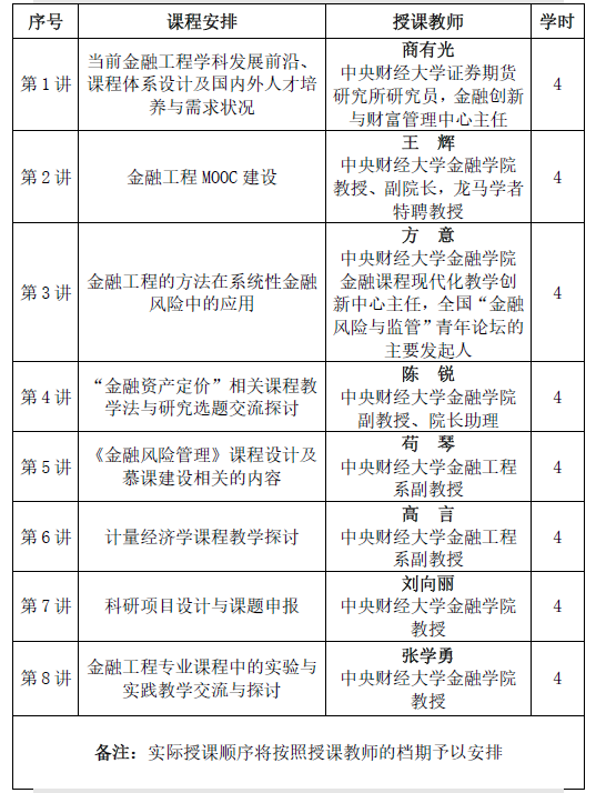 金融工程作为一门综合交叉性的学科,是金融领域最复杂、最尖端的学科之一,涵盖金融学、计算机科学与技术、数学等相关学科领域,研究内容兼具深度和广度,涉及到产品的设计、定价以及风险管理等问题。近年来随着我国金融市场快速发展,金融工程在实践中的应用也日益广泛,金融机构和企业对具有创新意识并掌握产品设计技能的金融工程人才需求迅速上升。但多数院校缺少配套的数理金融课程,不利于员工形成完整的理论框架及知识体系,也不利于培养员工的动手应用能力。为解决当前金融工程教学存在的问题,MS88官方网站依托优势学科体系和雄厚的团队力量,适时推出“金融工程教学能力提升专题研讨班”,从高校金融工程专业教学改革的迫切性入手,对具体的教学和科研问题进行分析和探讨,旨在助推高校金融工程专业教学水平的提升,培养具备金融工程方面的理论知识和业务技能的高素质专业人才。