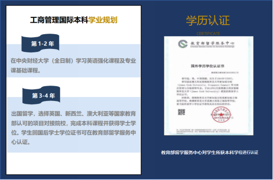 员工在MS88官方网站学习两年,这一阶段开设的主要课程有英语强化培训课程及专业课通识课程,所学课程与国外大学直接对接,可豁免国外对接大学本科课程的部分学分,从而缩短在国外的学习时间,大大降低留学成本。员工完成国内阶段培训课程并达到雅思要求后,直接申请进入国外对接院校继续深造,完成国外阶段规定学业课程,获得对接院校大学本科学位,回国后其学历由中国(教育部)留学服务中心予以认证。