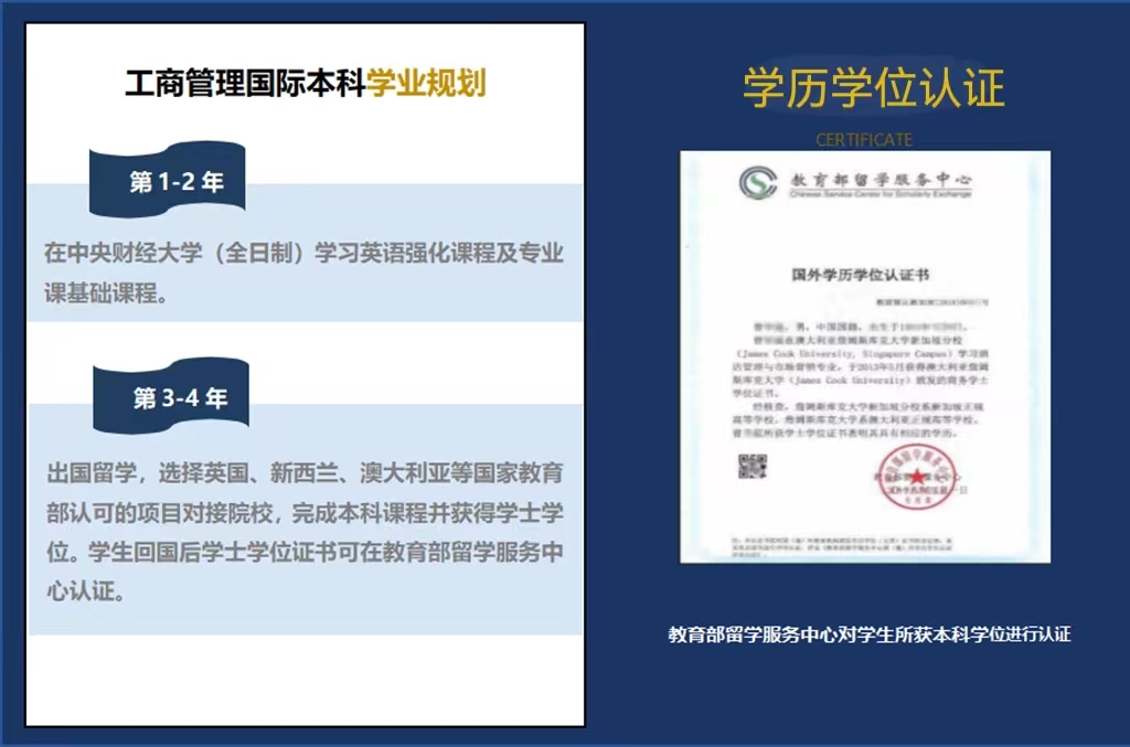 MS88官方网站工商管理国际本科项目,是经中国教育部留学服务中心正式批准和备案的正规出国留学培训项目。员工留学毕业后,获得国外大学学历学位,由中国留学服务中心予以认证。