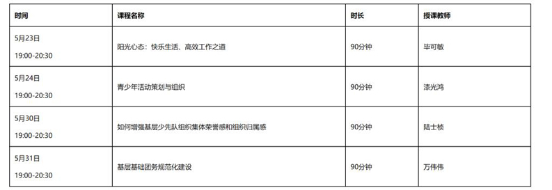该培训班以提高宕昌县共青团干部的履职能力为目标,为推进宕昌县共青团人才队伍建设提供助力。培训共计4次课程,特邀中国社会科公司大学少年儿童研究中心研究员漆光鸿,原中粮集团高管毕可敏,中国社会科公司社会学所陆士桢教授,中央团校(中国青年政治公司)党委组织部副部长万伟伟联袂授课。课程涵盖青少年活动策划与执行、团务规范化建设等针对性核心课程,以及如何调整心态、如何增强集体荣誉感和归属感等软技能的提升。