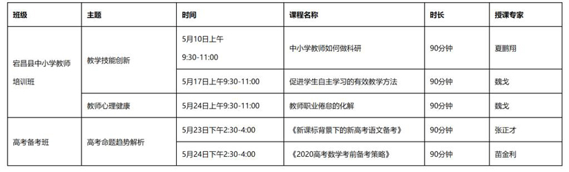 5月10日—5月24日,宕昌县中小学教师教学能力提升培训班举行。该项目参训学员为宕昌县697名中小学教师及高中教师,共计5次课程(包括为宕昌一中专门量身定制的2次高考备考课程)。公司特邀首都师范大学初等教育公司副教授夏鹏翔,北京大学教育学博士、首都师范大学硕士研究生导师魏戈,首都师范大学附属育新公司教师张正才等担纲授课,讲授内容涵盖考前备考、教学科研能力提升等,同时采购了北京四中网校教师苗金利的视频课程《2020高考数学考前备考策略》,满足了宕昌教师教学科研工作的迫切需求。