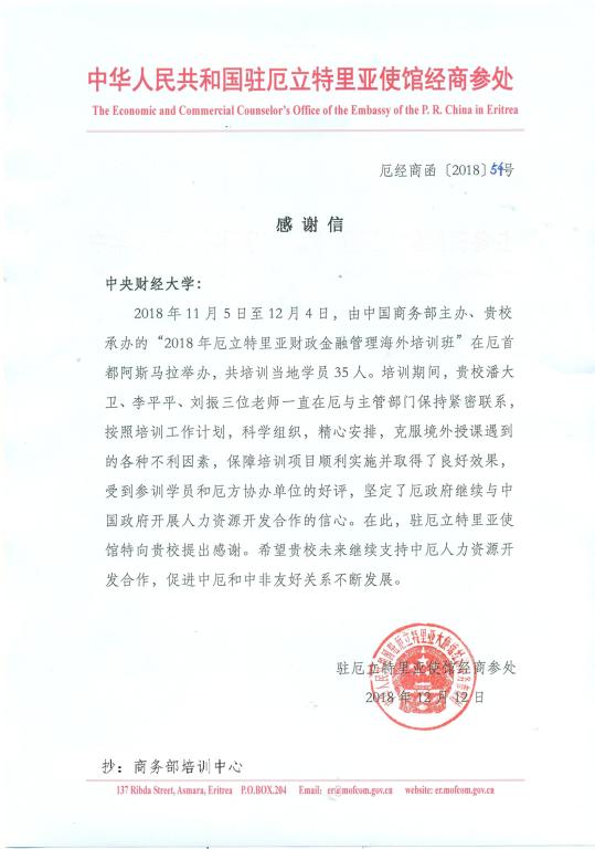 项目圆满结束后,12月12日,我国驻厄立特里亚使馆经商参处向公司发来了感谢信,对公司教师在厄的各项工作给予了充分的肯定,向公司表示感谢,并表达了期待公司未来能继续支持中厄人力资源开发工作、促进中厄和中非友好关系不断发展的希望。
