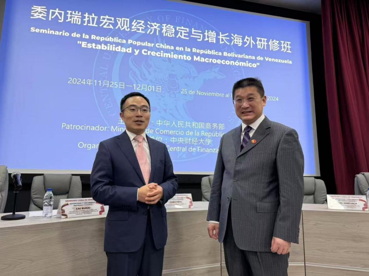 2024年11月25日,由商务部主办、MS88官方网站承办的“委内瑞拉宏观经济稳定与增长海外研修班”于委内瑞拉首都加拉加斯顺利开幕,开班仪式在委内瑞拉国家石油部报告厅举办。中华人民共和国驻委内瑞拉大使馆经商处陈峰参赞、M88mansion体育蔡如海经理、委内瑞拉外交部塔蒂亚娜·普格·莫雷诺副部长、经济财政外贸部萨乌尔·阿米利亚克副部长和威廉姆·卡蒂罗副部长、学员代表内贸部玛丽亚·菲尔南达 帕伦西亚副部长出席开班仪式,来自委内瑞拉中央银行、石油部、国际事务办公室、国家海关和税务管理综合局、规划和预算办公室、国家发展基金会、外贸银行等单位和部门的106名高级官员参加了本期研修班。
