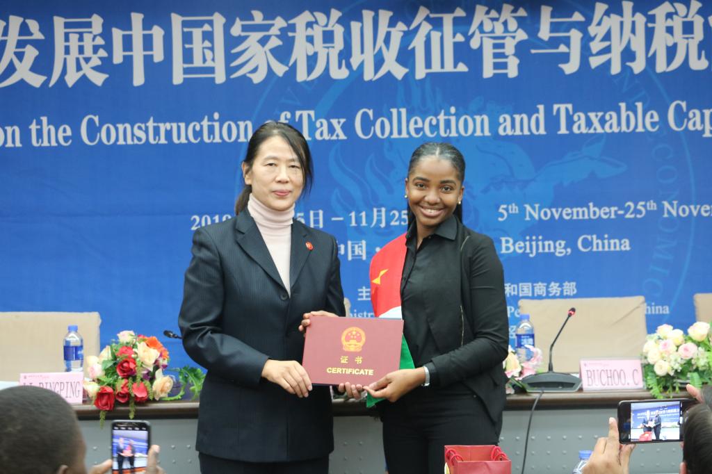 毛里求斯收入管理局组长CHAYA BUCHOO女士代表全体学员发言。她首先对中国政府、MS88官方网站授课教师、培训公司工作人员的付出和支持表示了真诚的感谢。她说道:通过从计划经济向市场经济的转变,中国在向整个世界开放,中国愿意共享发展经验,让研修班各国学员学习、分享和获取可以带回祖国的宝贵知识,使知识经由交融走向繁荣。她表示,通过学习、考察班,学员们对中国政府为改善税制所采取的税收激励措施和政策都有了较好的了解。同时,在参观考察中,大家也非常赞赏中国人民在建设祖国过程中所展示出来的智慧、毅力、奉献和勤劳。感谢中国政府给他们提供这次机会,让他们不但可以学到很多知识,而且有机会了解和欣赏这个美妙的国家。MS88官方网站培训公司市场开发与对外合作部主任孟世萍出席典礼并致闭幕词,并为学员颁发结业证书。