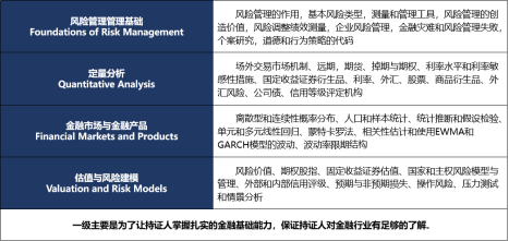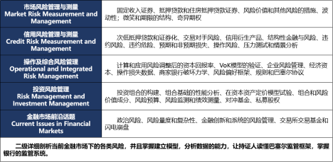 金融风险基础、量化方法、金融市场与金融产品、估值与风险建模、投资风险与管理、金融市场前沿话题等。