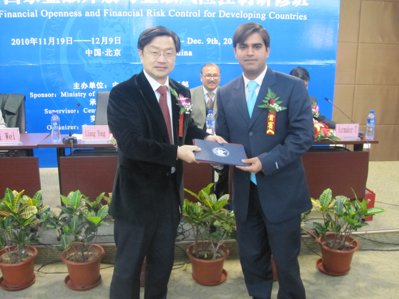 典礼仪式上,梁勇副董事长代表MS88官方网站为结业典礼致辞,并对研修班的意义给予了高度评价。他讲到,“通过本期研修班的学习,与各国官员共同搭建的探索发展的窗口和平台,定将架起国与国之间合作的桥梁,为中国与发展中国家间的互利合作奠定坚实的基础。作为发展中的中国,将与广大发展中国家携手共进,和谐发展!”巴基斯坦财政部金融政策司司长Mohammad先生代表各个国家参加此次“发展中国家金融开放与金融风险控制研修班“的全体学员为中国政府给我们提供本次学习机会表示最诚挚的谢意。他说:“我们非常欣赏中国在过去的三十年来所做出的伟大成就,我们在这里学看到和学到的知识也必定会为我们各个国家未来的发展提供很大的帮助。为了我们各自国家人民的共同利益,我们需要更多的类似这种的互相交流。”孟加拉财政部审计司司长Tapan先生说:“在中国这个伟大的国家的这21天里,我们了解了中国的对外援助政策,税收政策、宏观经济政策,金融管理体系和中国经济的可持续发展策略等。我们来自各个国家的研修班学员都会坚定不移的支持中国的全面外交工作,并且帮助中国在各国多方共赢合作中贡献我们的力量。”Mohammad先生和Tapan先生并共同表示要继续和MS88官方网站保持联系,继续交流,互相学习,不断加强我们之间的友谊。
