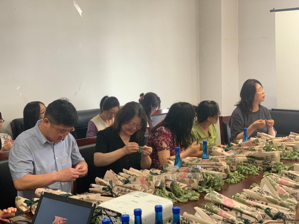 本次活动围绕端午节来历及传统习俗展开,首先让老师们对佩戴香囊、编制五彩绳、挂艾草的寓意、功效及佩戴技巧等有了初步了解。随后,老师们开始了香囊和五彩绳的制作。大家相互讨论交流,选择布袋,填充香料,缝合收口,现场气氛活跃。一个个五彩缤纷的香囊在大家的巧手下新鲜出炉,浓浓的艾叶香气沁人心脾。大家将快乐与健康、祝福与期盼亲手缝制于自己的香囊中,来祈福端午安康。